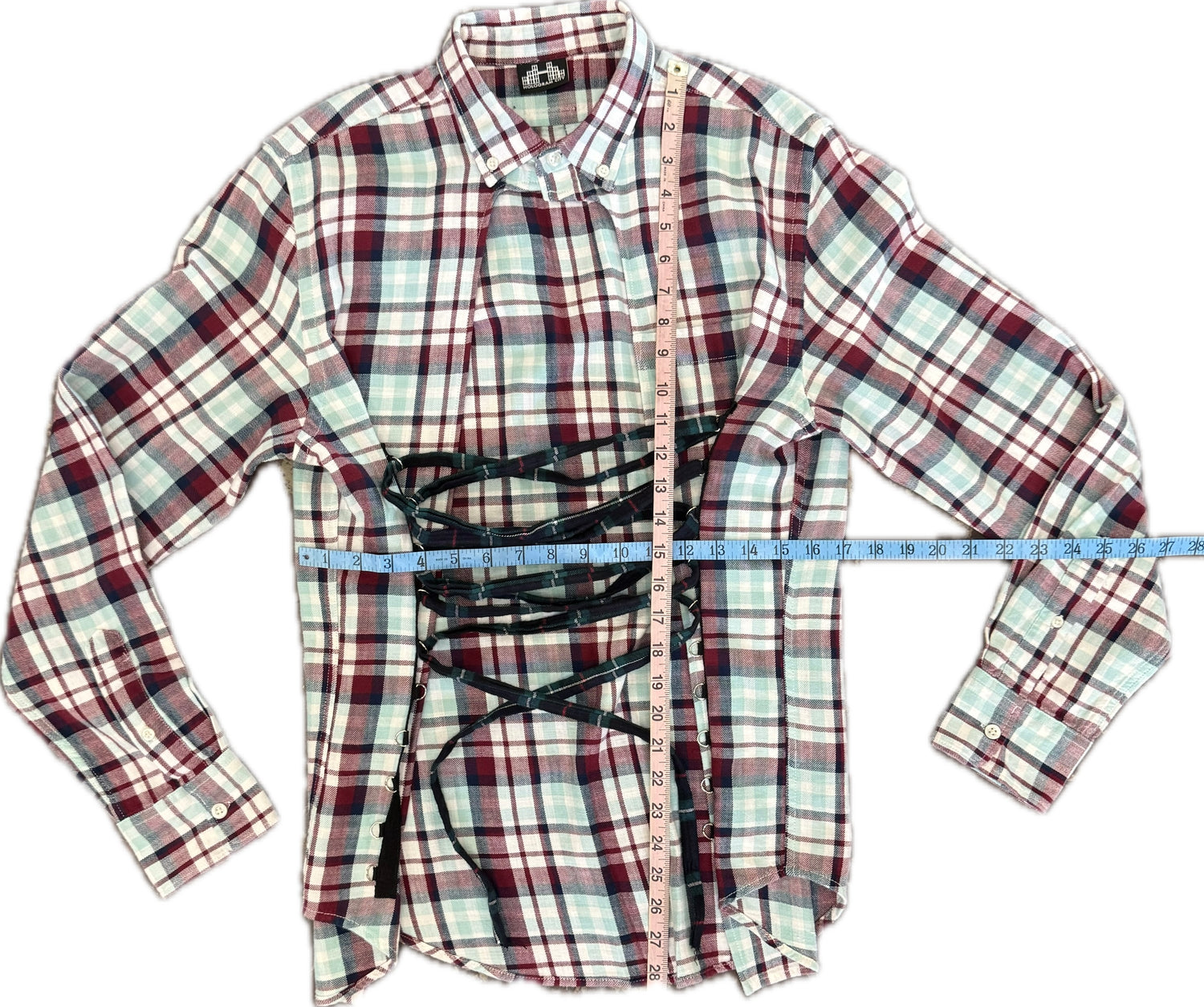 Vintage revamped flannel with Corseted design in front.